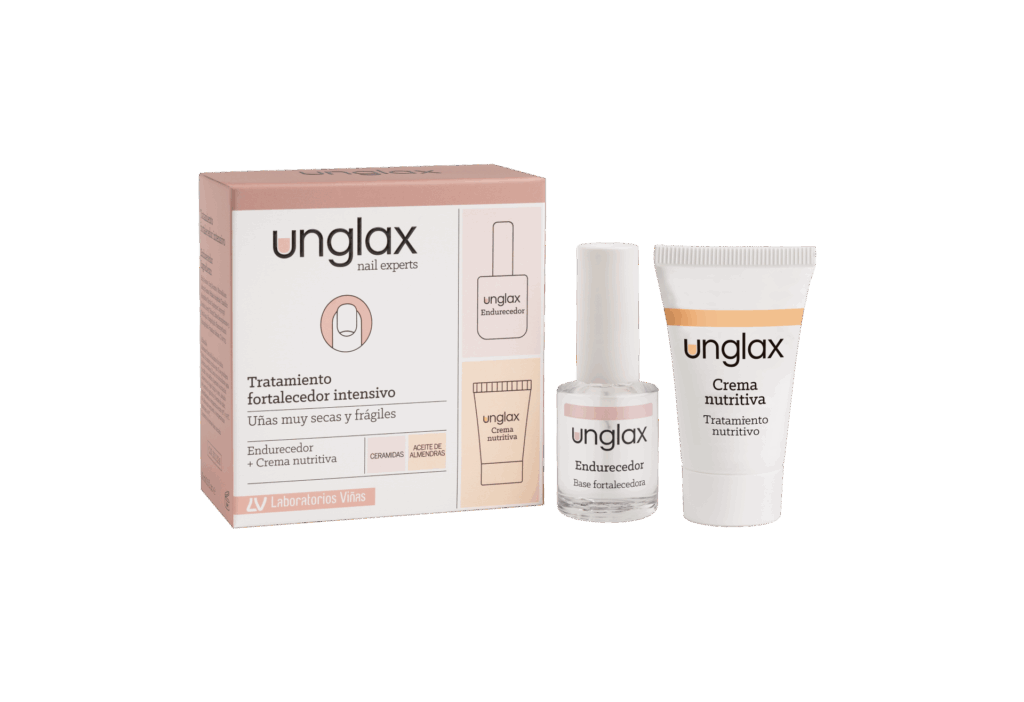 El fortalecedor intensivo de uñas de UNGLAX está pensado para las uñas secas y frágiles. Incluye una crema nutritiva con aceite de almendras que hidrata y fortalece y un endurecedor con ceramidas que brinda resistencia. Se recomienda aplicar la crema diariamente y el esmalte una o dos veces por semana para mejores resultados.